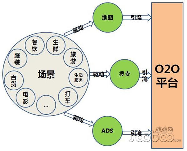 首先,O2O平臺借助地圖、搜索、ADS等的驅(qū)動,將產(chǎn)生用戶需求的場景包括餐飲、服裝、百貨、電影、旅游、生活服務、打車、生鮮等等引入到了O2O平臺上面來,打通了用戶和O2O平臺之間的供求渠道。即用戶在O2O平臺上可以通過搜索、地圖、ADS等入口,查找自己所需要的服務類別。